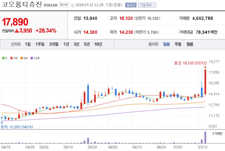 코오롱 그룹 주가 상승: 코오롱티슈진 외에도 코오롱 그룹의 다른 회사들의 주가도 일제히 상승하였습니다. 이는 코오롱 그룹 전체에 대한 투자자들의 긍정적인 인식을 반영한 결과로 보입니다.
