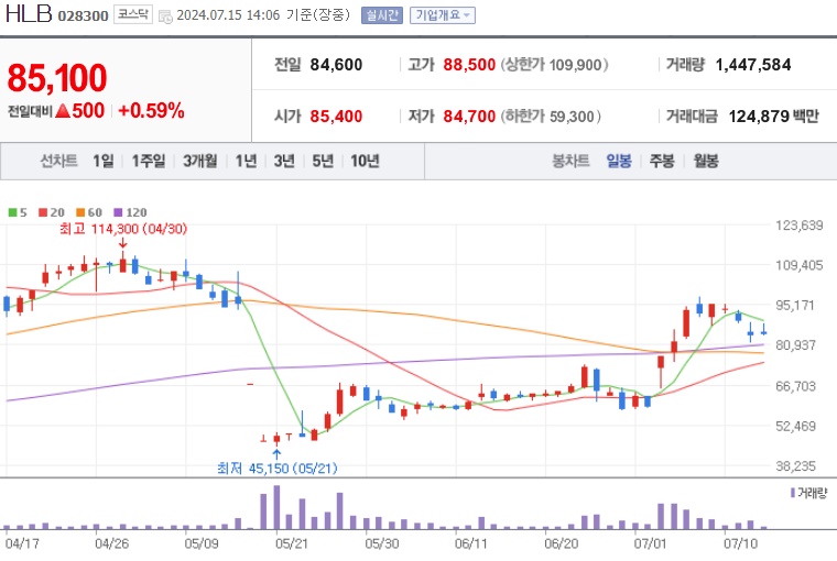 HLB의 주가는 85,100원입니다. 최근에는 HLB의 간암 신약 허가심사 재개를 위한 미국 식품의약국(FDA)과 미팅을 완료했다는 소식에 주가가 상승하였습니다. 그러나 이전에는 FDA 승인 불발로 인해 주가가 급락하였습니다. 이러한 변동성은 투자자들에게 주의를 요구합니다.